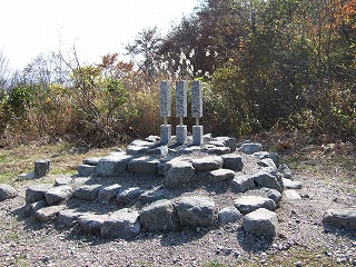 林道を更に進むと少し広くなったところに出ます(この先は通行止めになっていました)。 そこに最近建てられた記念碑(平成18年10月吉日)があり石柱3本に「どうしゅう」「さまの」「かよいみち」と書いてありました。 こんな所に何だろうと思って後で調べたところ、蓮如上人の弟子で五箇山の行徳寺を開いた室町時代の僧、道宗が五箇山から井波別院瑞泉寺を参詣するために毎月通った道とされ、城端山岳会が50周年記念事業として設置したものだということが分かりました。