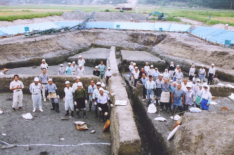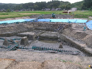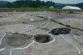 | 遺跡全貌、手前の穴は井戸の跡 |