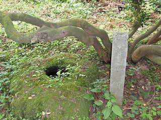 案内板には「自然石に穴をうがった石鉢、旱天期でも水は決してかれることがないといわれている。 神保城主はこの水におとす月影で時刻を知ったとされている」と書いてある。